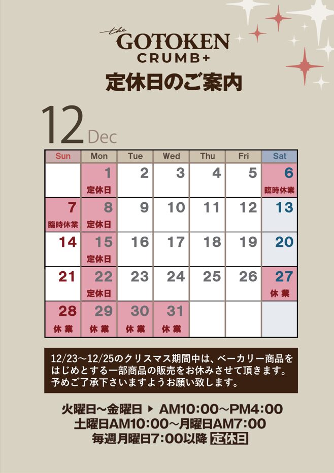 【工場直売所】CRUMB+(クラムプラス)店 12月、2026年1月定休日のお知らせ
