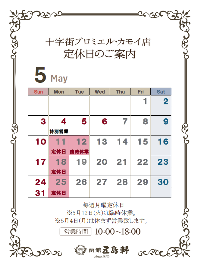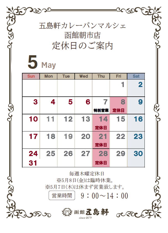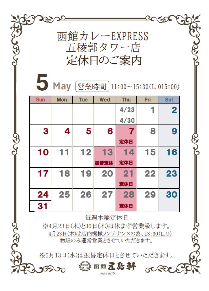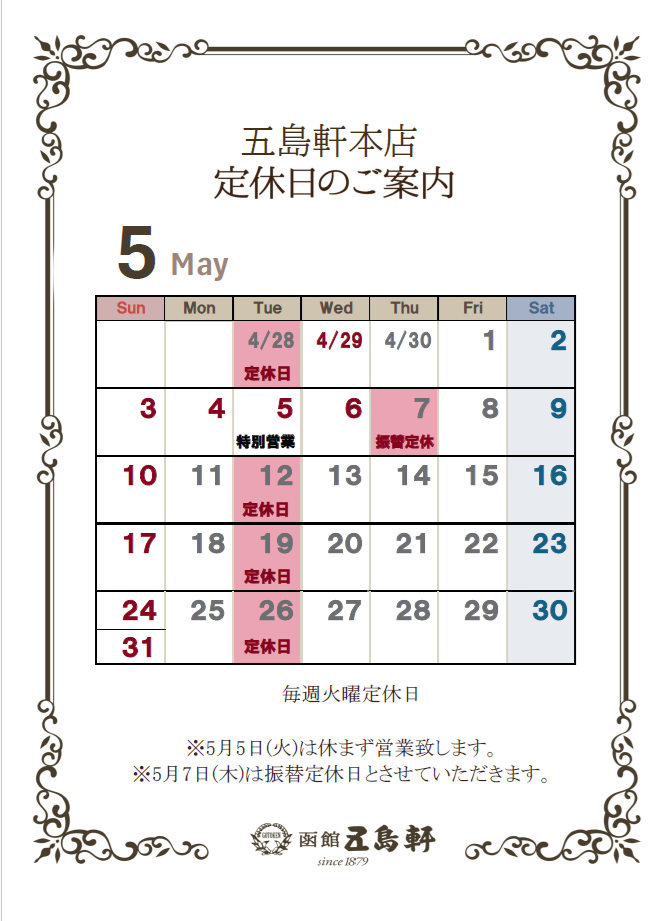 【五島軒】各店5月 定休日のご案内